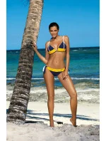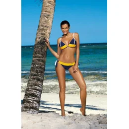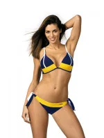 Módní dvoudílné plavky v bikinovém střihu. Košíčky jsou zespodu vyztužené, mají boční podšívku a pevnou (neodnímatelnou) push-up výplň. Dokonale tvarují, zvedají a opticky zvětšují prsa. Vytvářejí svůdný výstřih. Velmi pěkně sladěné barvy dělají dojem. Dvě látky - hladká a mírně lisovaná - jí dodávají zajímavý charakter a odlišují ji od ostatních. Obvod se zapíná sponou. Popruhy uvázané u krku. Kalhotky pohodlně zavázané na obou stranách boků - to nejlepší. Celek působí elegantně, žensky, sexy a moderně. A dokonale zdobí tělo. Vřele doporučujeme!
