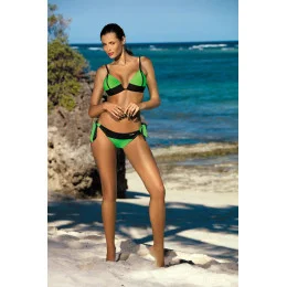 Módní dvoudílné plavky v bikinovém střihu. Košíčky jsou zespodu vyztužené, mají boční podšívku a pevnou (neodnímatelnou) push-up výplň. Dokonale tvarují, zvedají a opticky zvětšují prsa. Vytvářejí svůdný výstřih. Velmi pěkně sladěné barvy dělají dojem. Dvě látky - hladká a mírně lisovaná - jí dodávají zajímavý charakter a odlišují ji od ostatních. Obvod se zapíná sponou. Popruhy uvázané u krku. Kalhotky pohodlně zavázané na obou stranách boků - to nejlepší. Celek působí elegantně, žensky, sexy a moderně. A dokonale zdobí tělo. Vřele doporučujeme!