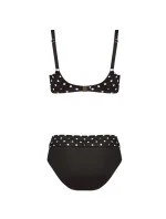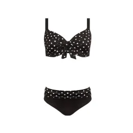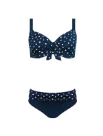 Dvoudílné dámské plavky s puntíky. Vrchní díl s kosticí, nevyztužený, s pevnými ramínky na posouvání. Kalhotky jsou vysoké, ve vrchní části přeložené a v případě potřeby je možné je zvednout až pod prsa. Vhodné i pro větší konfekční velikosti.