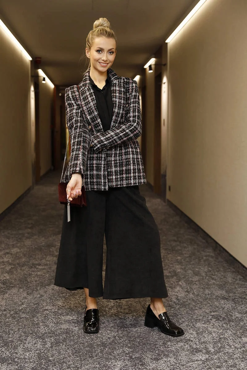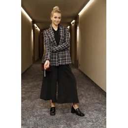 Sako má klasický střih, je vypasované, má dvě kapsy a zapíná se knoflíky. Ramena jsou vyztužená vycpávkami. Model má délku k bokům a má podšívku.