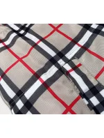 Jedna strana vesty je hladká a druhá je ozdobená károvaným vzorem burberry. Model má volný trapézový střih, stojáček, dvě kapsy bez zapínání a zapíná se zipem. Vesta má délku k bokům. Spodní okraj modelu je půlkulatý a přední část vesty je o něco kratší než zadní.