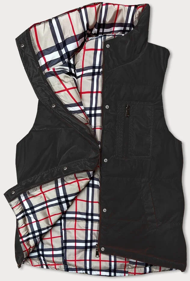 Jedna strana vesty je hladká a druhá je ozdobená károvaným vzorem burberry. Model má volný trapézový střih, stojáček, dvě kapsy bez zapínání a zapíná se zipem. Vesta má délku k bokům. Spodní okraj modelu je půlkulatý a přední část vesty je o něco kratší než zadní.