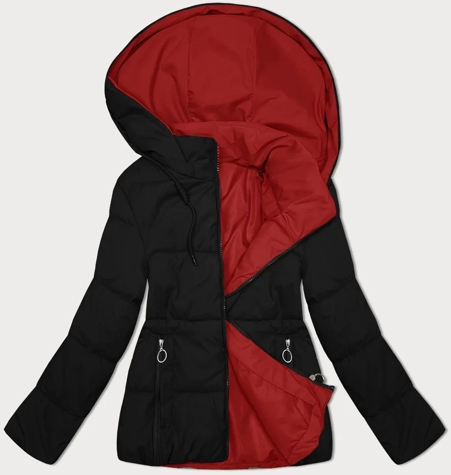 Černo-červená oboustranná krátká dámská bunda s kapucí (16M2155-270)