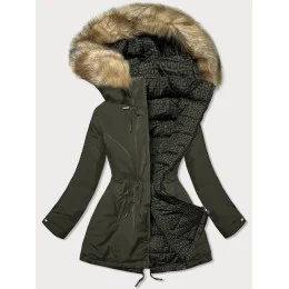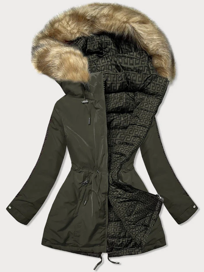 Jedna strana bundy je hladká a druhá strana je prošívaná. Model je zateplený syntetickou péřovou výplní, má dvě kapsy a zapíná se zipem. Bunda má kapuci se stahujícími šňůrkami. Kapuci je možné odepnout. Kapuce je olemovaná kožešinou, kterou je možné odepnout. V pase modelu je stahující šňůrka. Model má vzadu malý rozparek se stahující šňůrkou. Ozdobné prvky mají stříbrnou barvu.