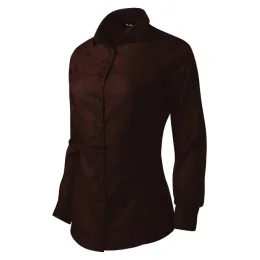 jemný strečový materiál projmutý střih s bočními švy dvojité sedlo na zadním dílu pasové a prsní záševky dvoudílný košilový límec přední kraje začištěny légou dlouhé rukávy s šikmou manžetou na 2 knoflíčky perleťové knoflíčky v barvě materiálu (1 náhradní navíc) tvarovaný dolní kraj