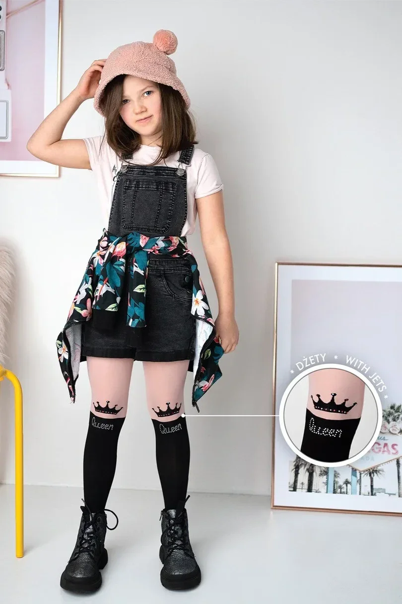 Dívčí vzorované punčocháče z mikrovlákna s nalepenými kamínky. Díky použití 3D technologie jsou punčocháče příjemné na dotek, měkké a dobře přiléhají k nohám. kalhotková úprava. všitý malý klín. ploché švy.