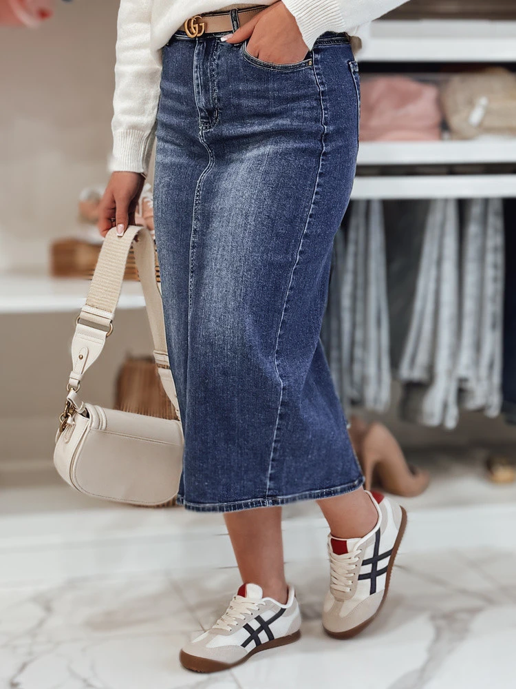 Midi džínová sukně pro příznivce městského stylu, klasický střih s vysokým pasem a decentním rozparkem v zadní části kombinuje pohodlí s nádechem ženskosti. Díky ozdobným kapsám a vypasovanému střihu se model hodí jak k volným svetrům, tak k vypasovaným topům.