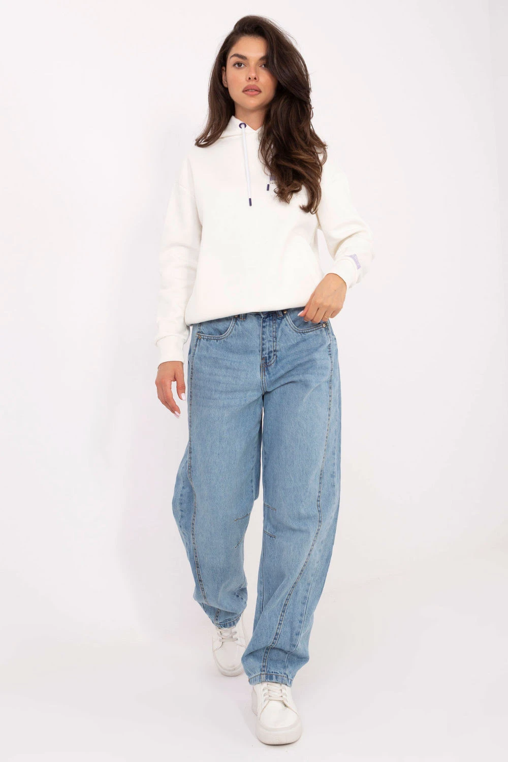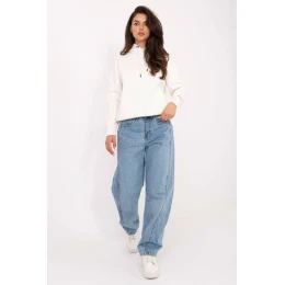 Dámské džíny ve střihu balónového fitu jsou módní volbou na každý den v ležérním stylu. Vyrobena z vysoce kvalitní bavlny, poskytují pohodlí a volnost pohybu. Vysoký pas krásně zdůrazňuje pas, zatímco charakteristický střih s volnějším vrškem a zúženými nohavicemi dodává postavě moderní vzhled. Na přední straně jsou praktické kapsy, vzadu klasické otevřené kapsy. Model se zapíná na zip a knoflík, vyrobený z hladkého džínoviny, který lze snadno sladit s mnoha každodenními outfit.