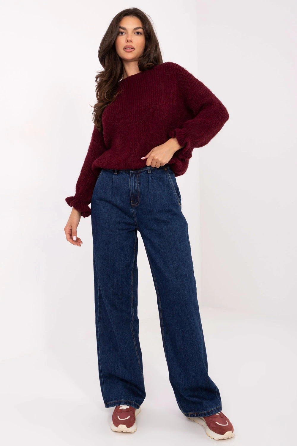 Dámské džíny s širokými nohavicemi vyrobené z tmavého džínového materiálu jsou ideální volbou pro každodenní, ležérní stylizace. Vysoký pas zdůrazňuje pas, zatímco široké nohavice přidávají moderní charakter a pohodlí. Model má vsazené kapsy vpředu a klasické otevřené kapsy vzadu. Zapínání na zip a knoflík dokresluje celkový vzhled. Hladký materiál dělá džíny univerzální a snadné na kombinaci s různými kousky oblečení.