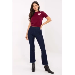 Moderní a pohodlné dámské dzínové kalhoty s efektním dokončením, s roztrhanými nohavicemi dole, které dodávají outfitu lehce rockový, casualový charakter. Vyrobené z odolné a elastické směsi bavlny, polyesteru a elastanu, poskytují pohodlí nošení a volnost pohybu po celý den. Model má vysoký pas s všitou gumou v pase, co zaručuje ideální přizpůsobení postavě a pohodlí, a široké nohavice typu zvon o opticky prodlužují nohy a vytvářejí módní, uvolněný vzhled. Kalhoty mají hladký vzor materiálu, chybí klasické zapínání a kapsy, co zdůrazňuje minimalistický, moderní charakter. Je to ideální volba na každodenní, casualové outfit, který spojuje pohodlí s výrazným, moderním designem.