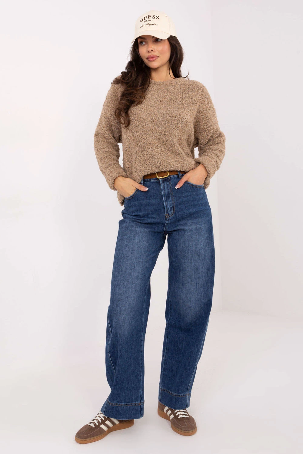 Tyto dámské džíny typu balloon fit jsou stylovým návrhem pro ženy, které ocení pohodlí a módní, nonšalantní vzhled. Jejich volný charakter je ideální pro každodenní stylové kombinace od volných setů s tričkem po více propracované outfity s košilí nebo blůzou. Model je vyroben z měkkého, elastického džínového materiálu, který kombinuje bavlnu, elastan, viskózu a polyester. Díky tomu se kalhoty skvěle přizpůsobí postavě a zajistí pohodlí po celý den. Džíny mají vysoký pas, který zdůrazňuje pas a opticky prodlužuje nohy. Široké nohavice ve střihu balloon fit dodávají celku moderní a uvolněný vzhled. Vepředu jsou kapsy do švu a vzadu otevřené kapsy. Zapínání na zip a knoflík zajišťuje pohodlí, a pásek s možností zapínání je praktickým a stylovým doplňkem.