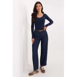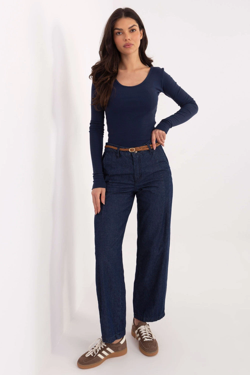 Dámské džíny typu wide leg jsou módní a pohodlnou volbou ve stylu casual, ideální na každodenní outfity. Vyrobené z vysoké kvality bavlny, poskytují pohodlí a odolnost po dlouhou dobu. Hladký vzor jim dodává univerzální charakter, díky čemuž se snadno kombinují s různými kousky šatníku. Model s vysokým pasem krásně zdůrazňuje pas a opticky prodlužuje postavu, zatímco široké nohavice zaručují volnost pohybu a zapadají do aktuálních trendů. Džíny se zapínají na zip a knoflík, co zajišťuje dobré přizpůsobení. Praktické kapsy zvyšují funkcionalitu a zapínací pletený pásek představuje stylový doplněk, který celkově dotváří vzhled a dodává kalhotám originální charakter.