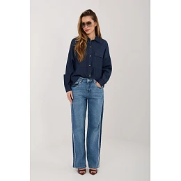 Dámské džíny s přímými nohavicemi jsou nadčasovým modelem, který se skvěle hodí do každodenního, ležérního stylu. Jednoduchý střih nohavic zaručuje pohodlí a univerzální vzhled, díky čemuž jsou kalhoty snadno kombinovatelné jak se sportovními, tak s klasickými kousky šatníku. Džíny jsou vyrobené z kombinace bavlny a elastanu, co zajišťuje, že materiál je příjemný na dotek, prodyšný a mírně elastický, díky čemuž se dobře přizpůsobuje postavě a zaručuje pohodlí po celý den. Model má střední (pravidelný) pas, který zaručuje pohodlí a přirozené přizpůsobení v pasu. Džíny se vyznačují hladkým vzorem a jejich charakter zdůrazňují ozdobné pruhy po stranách nohavic, které dodávají moderní a módní akcent. Kalhoty se zapínají na zip a knoflík, co zajišťuje klasické a pohodlné používání. Navíc jsou vybavené praktickými kapsami na zip, které zvyšují funkčnost modelu. Jsou to ideální volba na každý den do práce, na procházku nebo setkání s přáteli, kdy je důležité pohodlí a styl.