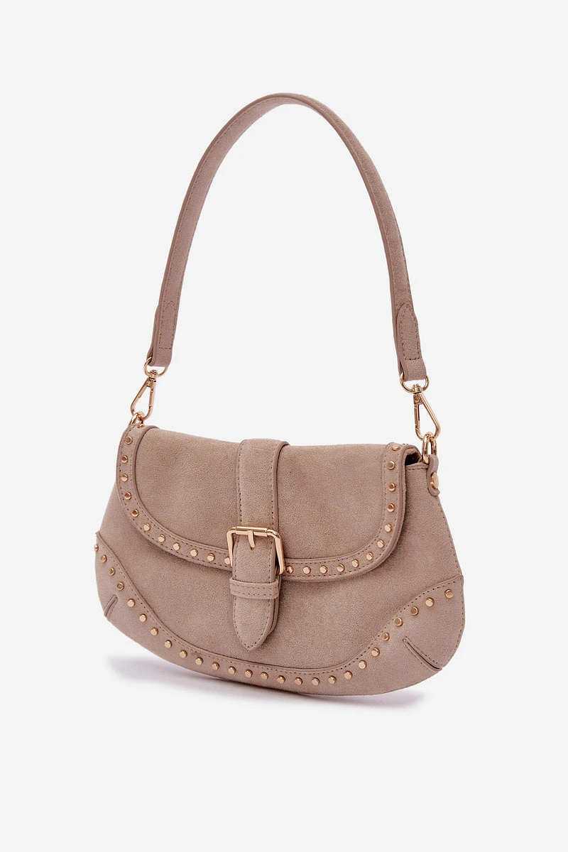 Malá dámská kabelka vyrobená z eko semiše. Její kompaktní rozměr ji činí ideální na každý den i na výlety, když potřebujete mít u sebe pouze nejdůležitější věci. Model má klapku zapínanou na magnetický klips, což zajišťuje pohodlí při používání. Kabelka je ozdobena zlatými nýty, které jí dodávají výrazný a moderní styl. Součástí jsou dva odnímatelné pásky – kratší na nošení přes rameno a delší, nastavitelné, umožňující nošení přes rameno. Uvnitř je kapsa na zip, ideální na drobnosti vyžadující dodatečné zabezpečení. Rozměry: šířka - 27 cm, výška - 16 cm, tloušťka - 3 cm.