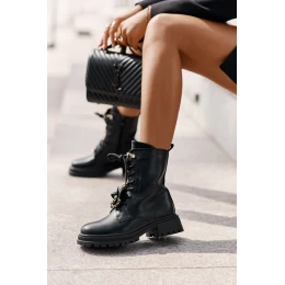 Dámské botky vyrobené z ekologické kůže. Usazené na plochém podpatku. Špičky jsou zaoblené. Zapínají se na zip na boku pro snadné obouvání, a dodatečné šněrování s roztomilými přívěsky jim dodává výjimečný šarm. Ideální na podzimní a zimní stylizace, skvěle se hodí k různým outfitům na chladnější dny. Při výběru velikosti se řiďte tabulkou velikostí.