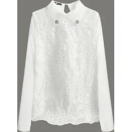 Halenka má volný střih a ve přední části je vyšívaná. Pod vyšívanou vrstvou je podšívka. Límeček se vzadu zapíná knoflíčkem. Halenka je doplněná dvěma brožemi, kterými je možné ozdobit límeček.