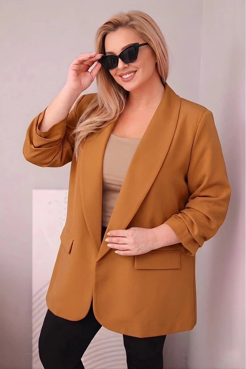 Elegantní dámské sako Plus Size tmavě camelové