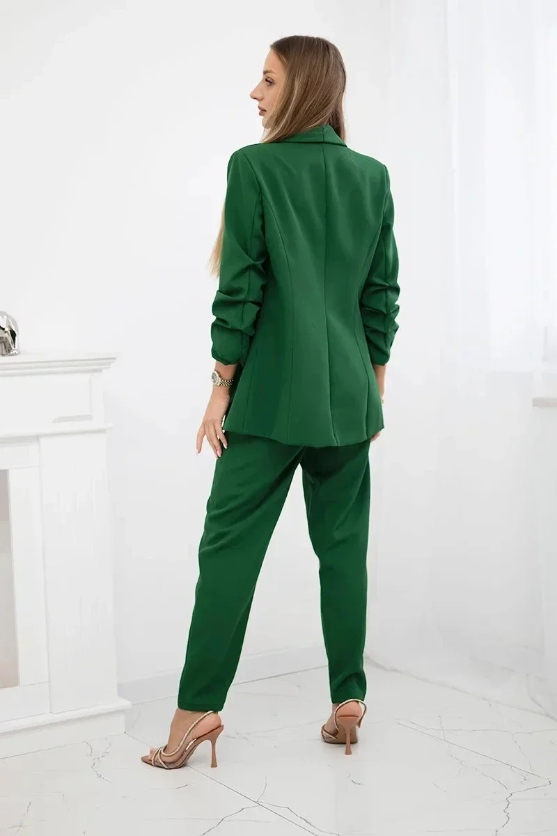 Představujeme vám elegantní sadu saka a kalhot. Bunda bez knoflíků s předními klopami. Bunda má podšívku. Kalhoty s kapsami a páskem. Pružný pásek všitý do pasu kalhot na zadní straně. Velmi módní a stylová sada. Sada je vyrobena z vysoce kvalitního materiálu. Velikost je univerzální a vyhovuje dámám velikosti S, M nebo L.