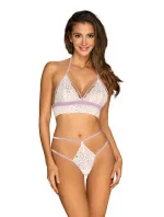 Tato sada zaujme všechny Vaše smysly! Smyslný střih, sexy ramínka a elegantní krajka, to vše v bílé barvě v kombinaci s jemnou levandulovou barvou. Tento průsvitný komplet vám vyrazí dech! Krásný tvar prsou a dokonalé přizpůsobení zaručí nastavitelný pásek nošený kolem krku. Elastický materiál a pružná ramínka zajistí skvělé pohodlí.