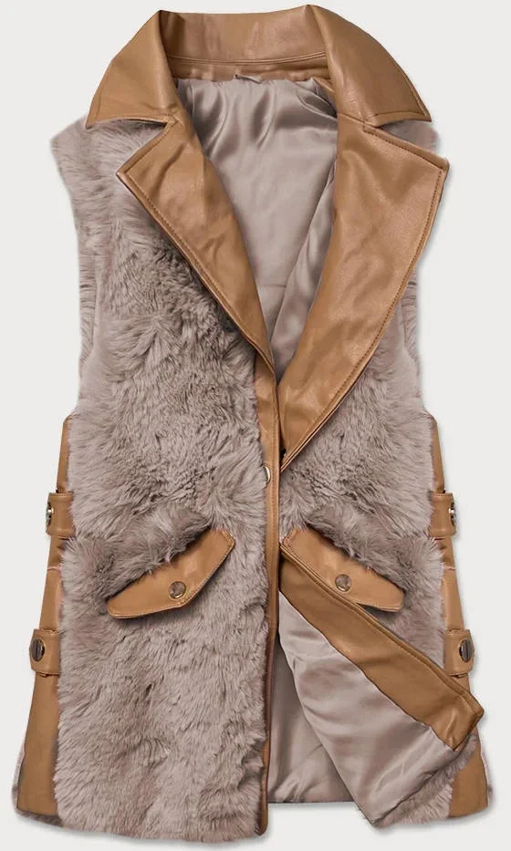 Elegantní vesta v karamelovo-béžové barvě z eko kůže a kožešiny (BR9592-48022)