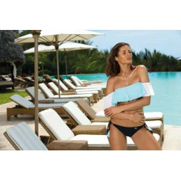 Horní díl tvoří vzdušný top s krátkými rukávy, pohodlně zavazovaný na zádech. Střih bez push-up a bez podvazků umožňuje maximálně krásný, přirozený dekolt. Spodní díl - hladké, na boku zavazované kalhotky se střapci. Model je k dispozici v mnoha atraktivních barvách, ze kterých si můžete vybrat. Vysoce kvalitní italská tkanina. Složení: 80 % polyamid, 20 % elastan.