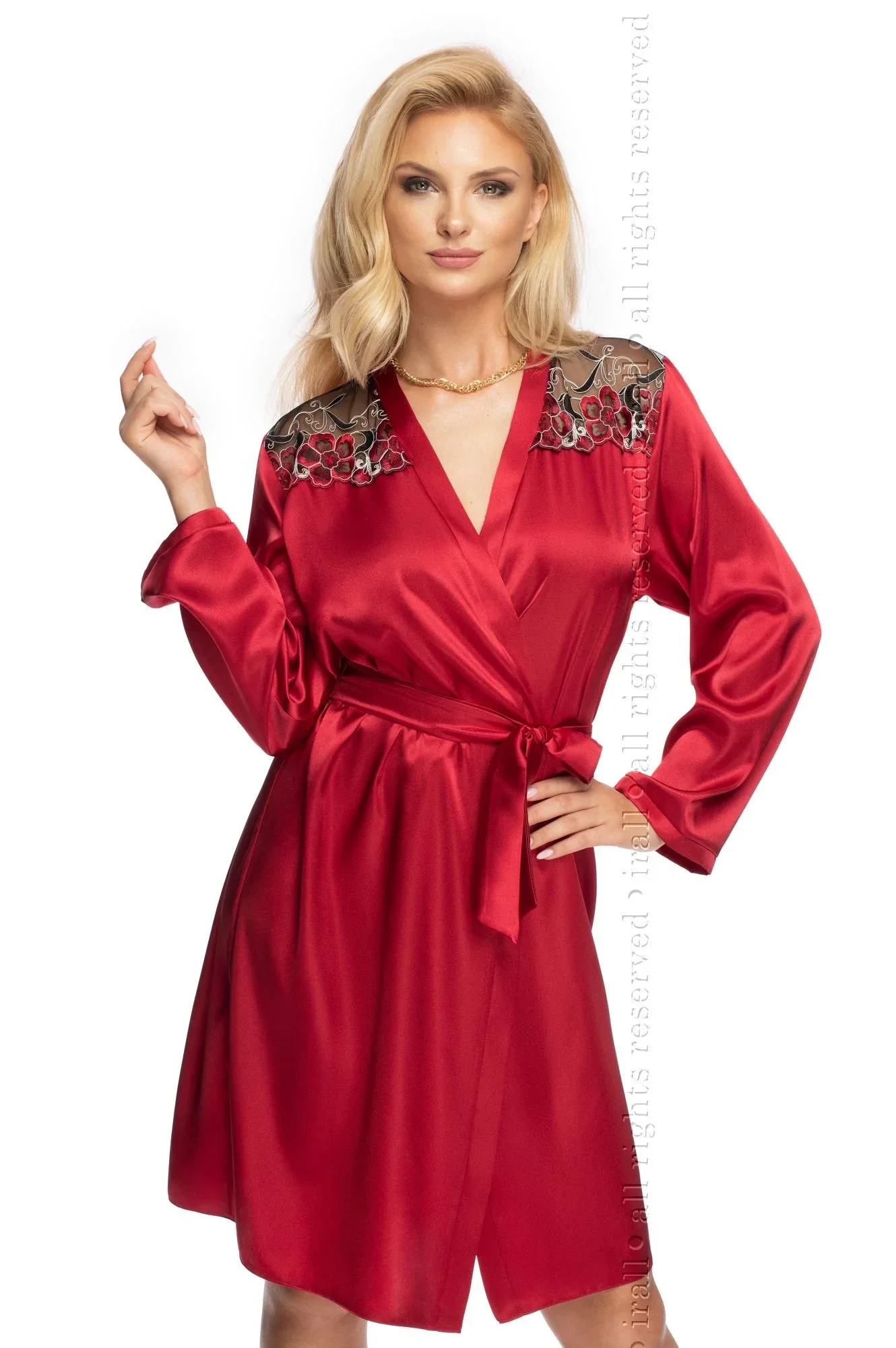 Elegantní župan z krásného saténu s luxusním perleťovým leskem, s krajkovými prvky na ramenou. V úžasné barvě. Dlouhé klasické rukávy a elegantní pásek v pase vám umožní vytvořit vzhled, který stojí za hřích. Špičková kvalita. Složení: 99 % polyester, 1 % polyamid.