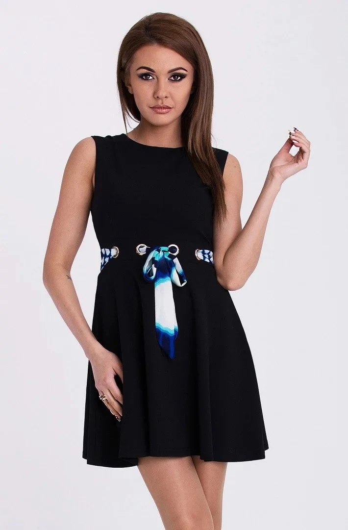 Dámské šaty bez rukávů. V pase šatů je protažený ozdobný pásek, který dodá šatům jedinečný efekt.