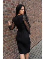 Černé, elegantní šaty s tylovými rukávy, ideální pro zvláštní příležitosti, velmi ženské. Výstřih do V, rukávy s jemnou gumou na zápěstí, pásek v pase. Pohodlný střih, zdůrazňuje siluetu, aniž by byl příliš těsný. Zapínání na zip na zádech. 95 % polyester, 5 % elastan.