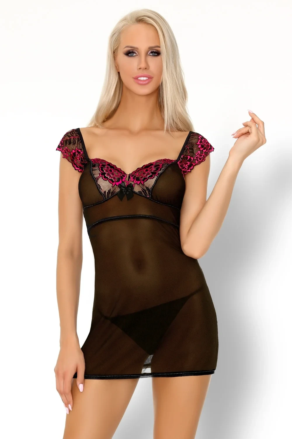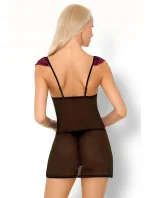Dámská košilka Kinge LivCo - z příjemného černého průsvitného materiálu - dekolt a ramínka zdobené bordovo-černou krajkou s květinovým vzorem - mezi poprsím mašlička - součástí košilky jsou tanga