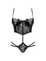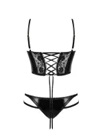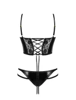 Erotická souprava Nirvina BEAUTY NIGHT FASHION - černá barva - vyrobená z krajky a lesklého materiálu podobnému latexu - krátký top s kosticemi má na zádech šněrování - připnutý k tangám pomocí háčku připomíná body - zboží je zabalené v dárkovém pytlíčku, který je ideální pro skladování i na praní