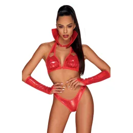 Tohle jste ještě neviděli! Zahřejte si letošní podzimní a zimní večery tímto sexy červeným kostýmem Vampines. Kostým je vyroben z měkké, pružné a lesklé látky, která na těle vypadá skvěle. Součástí je podprsenka s měkkými košíčky v podobě topu, zapínaná vpředu mezi prsy, tanga zavazovaná nad hýžděmi, poutavé rukavice a límec na krku.