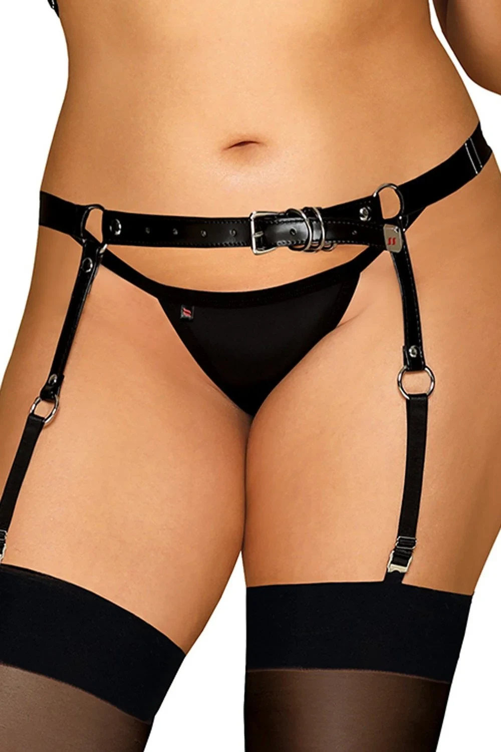 Erotický podvazkový pás A756 OBSESSIVE - černá barva - nádherná, černá kůže - nastavitelný pás okolo boků - působivá kombinace ozdobných prstenů - dodatečné nastavení velikosti v podobě kovové spony - měkký, jemný a na pokožku příjemný materiál - 30% polyuretan, 25% polyester, 15% guma, 25% kov - železo, 5% plast