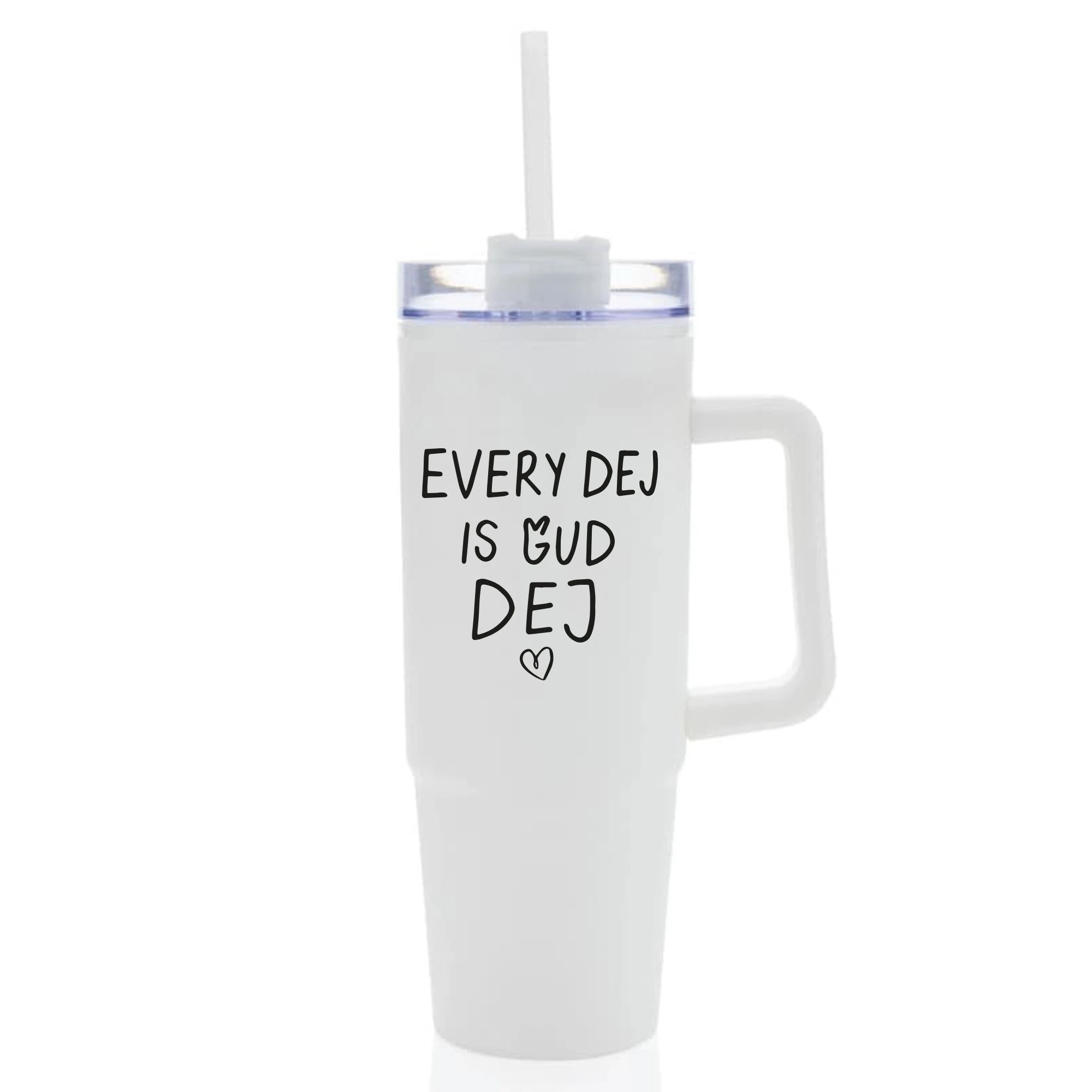 EVERY DEJ IS GUD DEJ - bílý cestovní hrnek s průhledným víčkem 900 ml