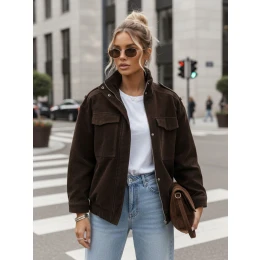Dámská bunda s mírně nadměrným střihem bomber, vyrobená z materiálu imitujícího semiš, je virálním hitem sezóny. Krátký střih a zvýšený stojáček dodávají celku moderní, městský charakter. Design kombinuje volnost nošení se strukturovanou formou, takže se dobře hodí pro každodenní nošení. Model se dobře hodí k ležérnímu i smart casual stylu.