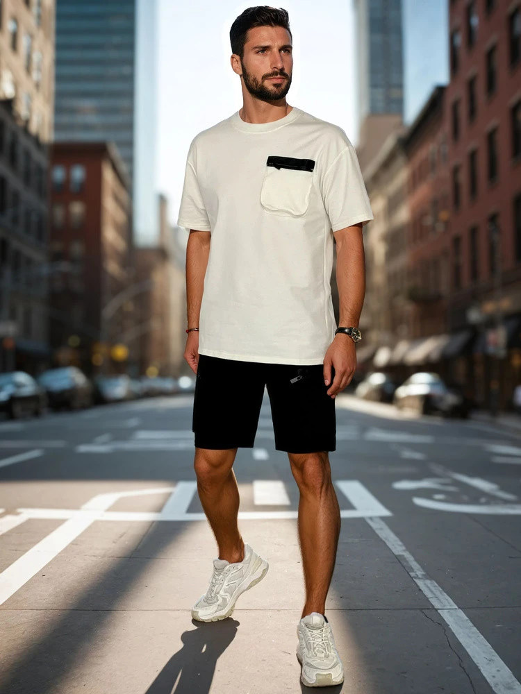 Tato dvoudílná pánská tepláková souprava je módní volbou. Tričko s krátkým rukávem má ozdobnou náprsní kapsu na zip, zaoblený výstřih a střih na míru pro celodenní pohodlí, zatímco cargo šortky mají čtyři kapsy, měkkou šňůrku v pase a nastavitelnou šňůrku. To vše v příjemném materiálu, který je ideální pro jarní dny, ať už jste ve městě nebo aktivní.