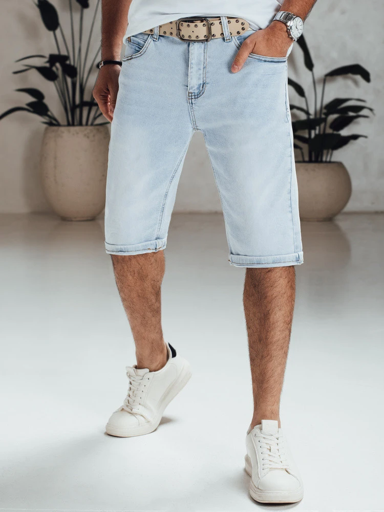 Pánské džínové šortky s lehce sepraným efektem, vybavené praktickým páskem s ozdobnými nýty. Klasické zapínání a ohrnuté nohavice doplňují uvolněný střih. Pohodlná volba na léto, ideální k teniskám i ležérním košilím.