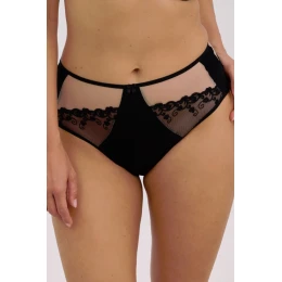 Wyrafinowane czarne figi z haftowanym tiulem to idealne połączenie elegancji i wygody. Przód ozdobiony delikatnym, przezroczystym tiulem z bogatym czarnym haftem o roślinnym motywie, który subtelnie podkreśla kobiece kształty. Tył wykonany z gładkiej, elastycznej mikrofibry, zapewnia komfort i perfekcyjne dopasowanie. Niewielka satynowa kokardka w pasie dodaje całości romantycznego charakteru.