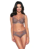 Ramiączka są regulowane (z metalowym, antyalergicznym regulatorem), szerokość dopasowana do rozmiaru. Zapięcie na dwurzędową lub trzyrzędową haftkę (trójstopniowe), boczne fiszbiny i mostek obszyty koronką zapewniają solidne podtrzymanie nawet przy większym rozmiarze. Tył z elastycznej mikrofibry zwiększa komfort i stabilność konstrukcji.