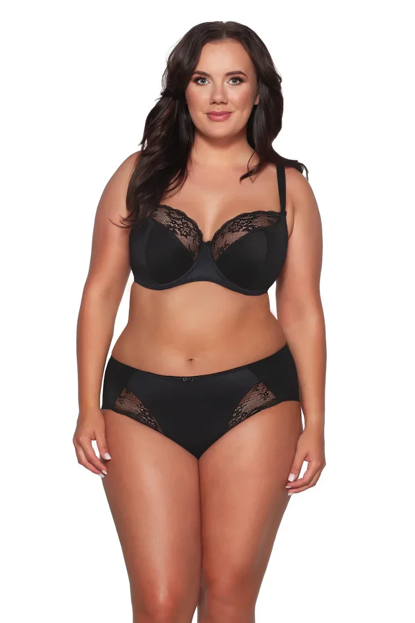 Klasické bikiny v plném střihu, vpředu zdobené krajkou, vzadu hladké