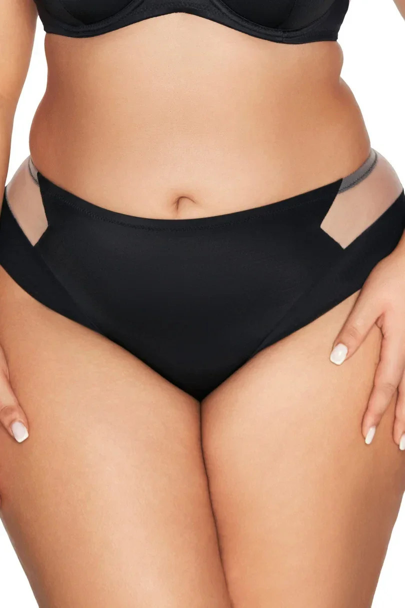 Černé hladké kalhotky s béžovou průsvitnou síťovinou na bocích. Jedná se o klasický model kalhotek se širokou gumičkou ukrytou v tunýlku z jemné látky.