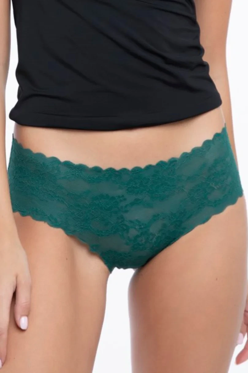 Elegantní maxišaty lákají květinovým krajkovým vzorem a mušlovým lemem. Klasický krepós vyšším pasem a širokými boky. Díky technologii laserového střihu v pase a výřezům na stehnech nevyčnívají pod přiléhavým oblečením. Kalhotky mají v rozkroku všitou hygienickou bavlněnou vložku.