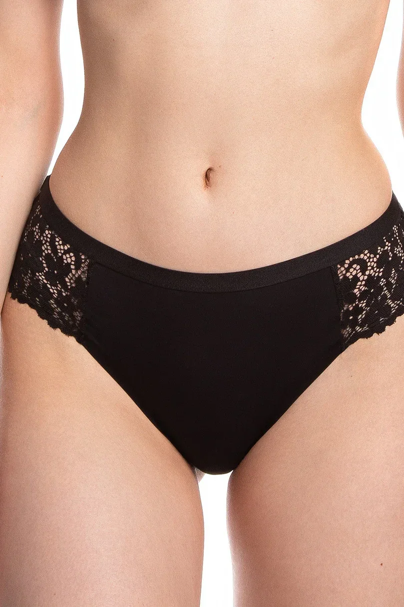 Působivé dámské kalhotky z hladkého laserem střiženého mikrovlákna na přední straně, na bocích a vzadu z prolamované krajky, v pase plochá pohodlná guma