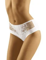 Plně pletené spodní díly z žebrovaného úpletu. Přední díl bohatě zdobený květinovou krajkou.