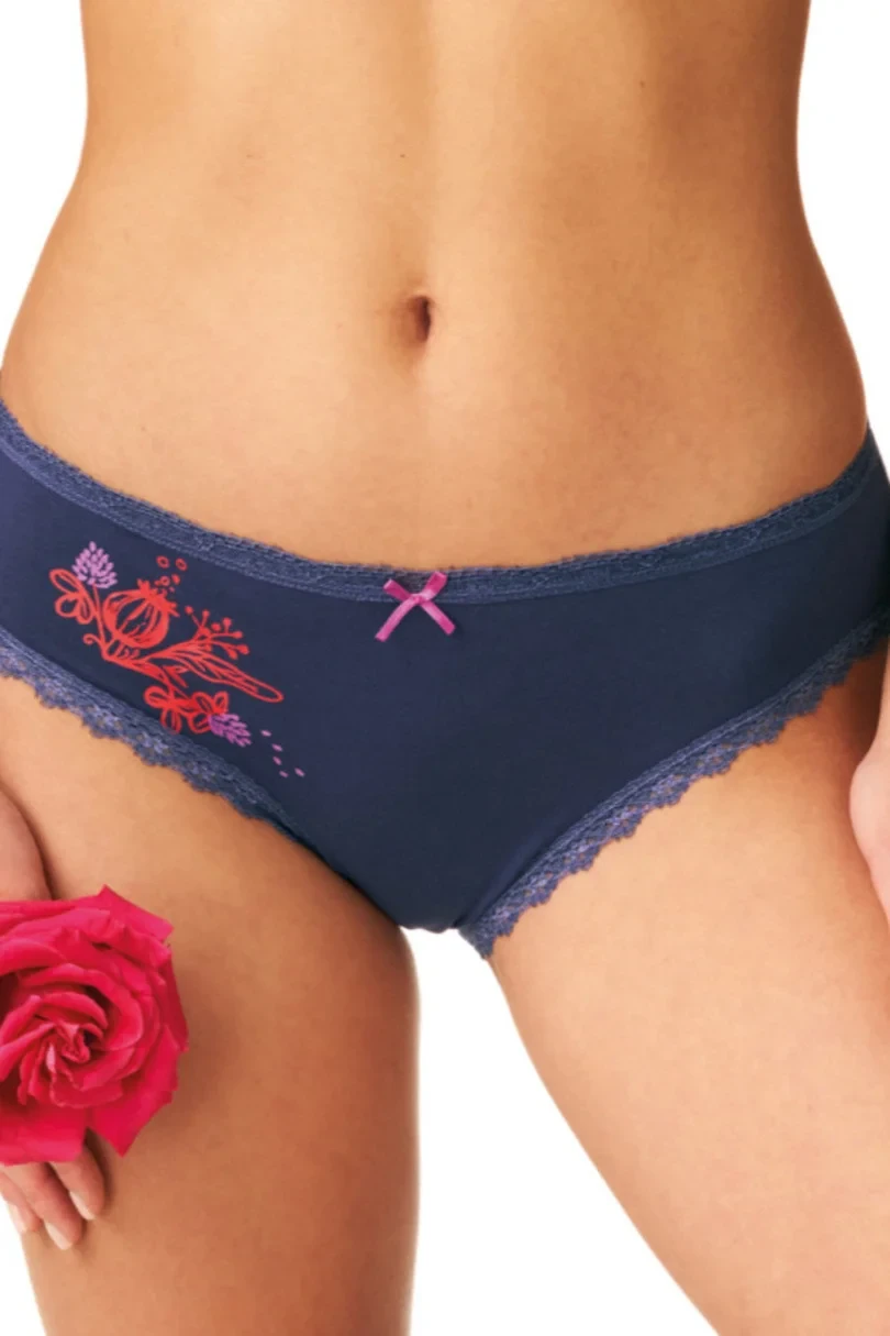 Dámské bikiny, s vyztuženými boky, vyrobené z kvalitní vzorované bavlny a krajky. Balení obsahuje dva kusy v uvedených barvách.