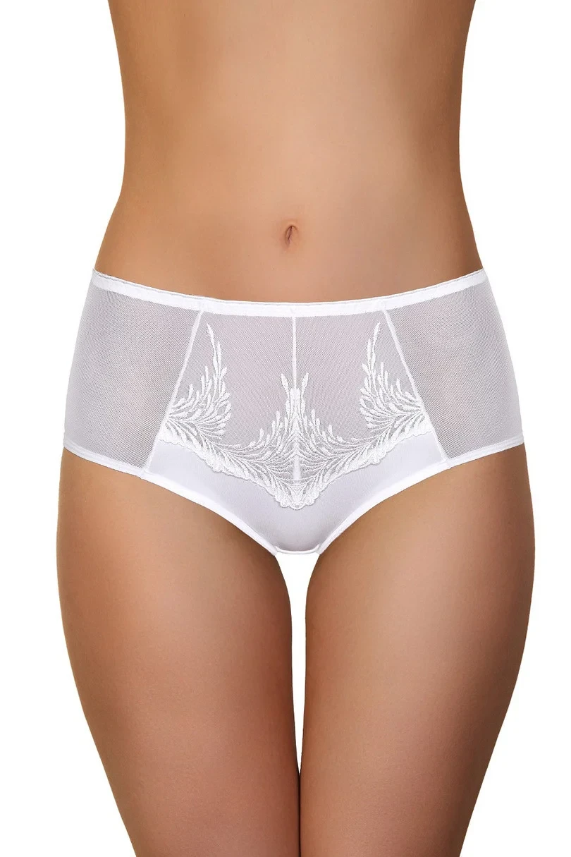 Klasické dámské kalhotky, kombinace síťoviny a mikrovlákna. Přední díl zdobený efektní výšivkou, zadní díl hladký.