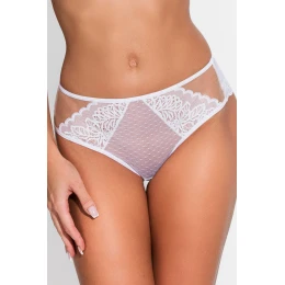 Béžové tylové boky pokryté bílou krajkou, síťovaná záda, spodní částó³ zakončená krajkou.