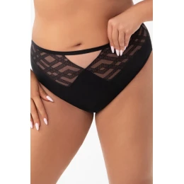 Dámské kalhotky. Vysoký střih. Otevřený střih. Zakrývá téměř celý zadeček. Vyrobeno z elastického tylu ve dvou barvách a elastické krajky. Vzadu zakončeno krajkovým lemem. Bavlněný rozkrok
