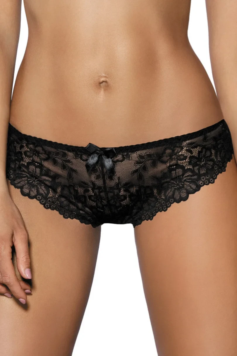 Dámské kalhotky z krajky s květinovým motivem, se saténovou mašlí v pase.