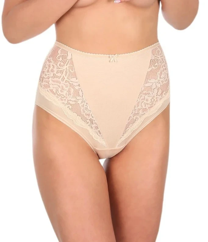 Kalhotky mají vysoký střih, vysokou linii pasu a plné boky. Efektní přední díl zdobí krajkové vsadky s květinovým motivem.
