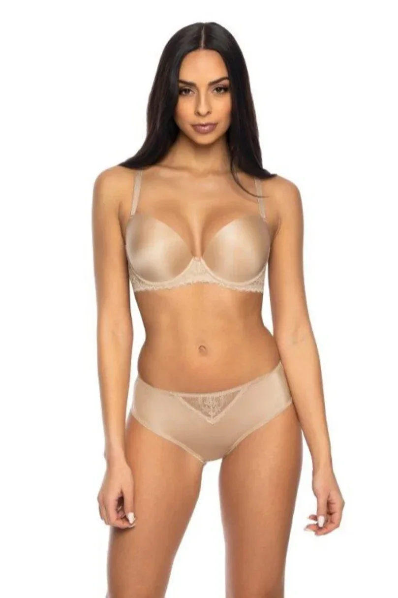 Dámské kalhotky z béžového úpletu s mírným leskem, krajkovou vsadkou vpředu a krajkovou vsadkou vzadu, která krásně zvýrazňuje ženské půvaby. Kalhotky dokonale přiléhají k tělu.